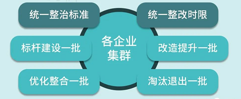 对存在突出问题的工业园区、企业集群、重点管控企业制定整改方案,做到措施精准、时限明确、责任到人。各企业集群要统一整治标准,统一整改时限,标杆建设一批、改造提升一批、优化整合一批、淘汰退出一批。