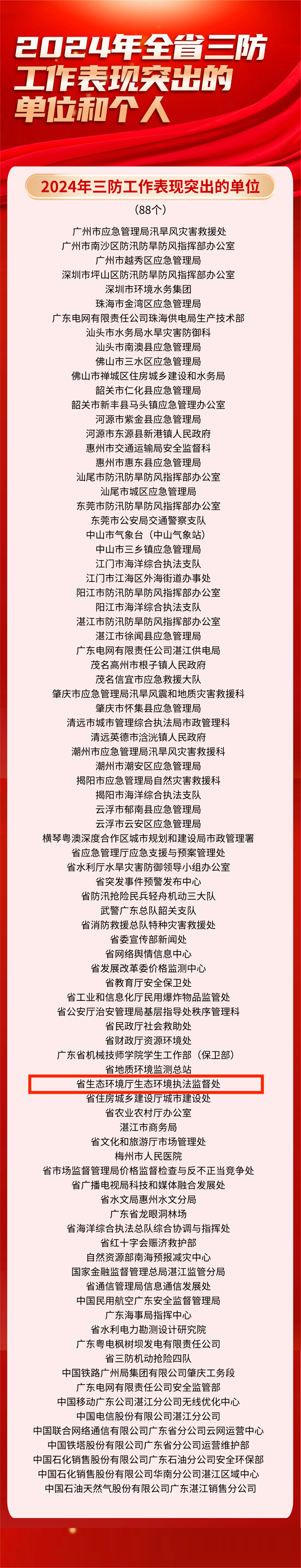 为发挥榜样示范带动作用进一步激励做好全省三防工作,近日,广东省防汛防旱防风总指挥部办公室对2024年三防工作表现突出的88个单位、185名个人予以通报表扬,其中,省生态环境厅生态环境执法监督处获2024年三防工作表现突出的单位,省生态环境厅生态环境执法监督处三级调研员傅昊、四级调研员周伟谋获2024年三防工作表现突出的个人。向以上获奖单位及人员表示祝贺!