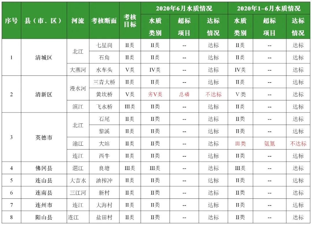 2020年6月国考断面达标情况:按照清远市自测数据统计,4个国考断面均满足国家水污染防治考核目标要求。