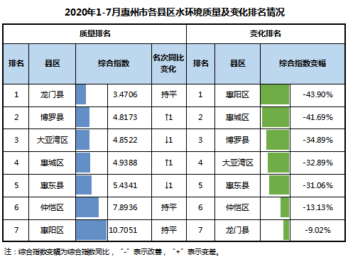 按照地表水环境质量考核断面综合指数排名,2020年1-7月,水环境质量由好到差依次排名为龙门县、博罗县、大亚湾区、惠城区、惠东县、仲恺区、惠阳区。与2019年同期相比,惠阳区、惠城区、博罗县、大亚湾区、惠东县、仲恺区、龙门县等7个县区水环境质量均有所改善。