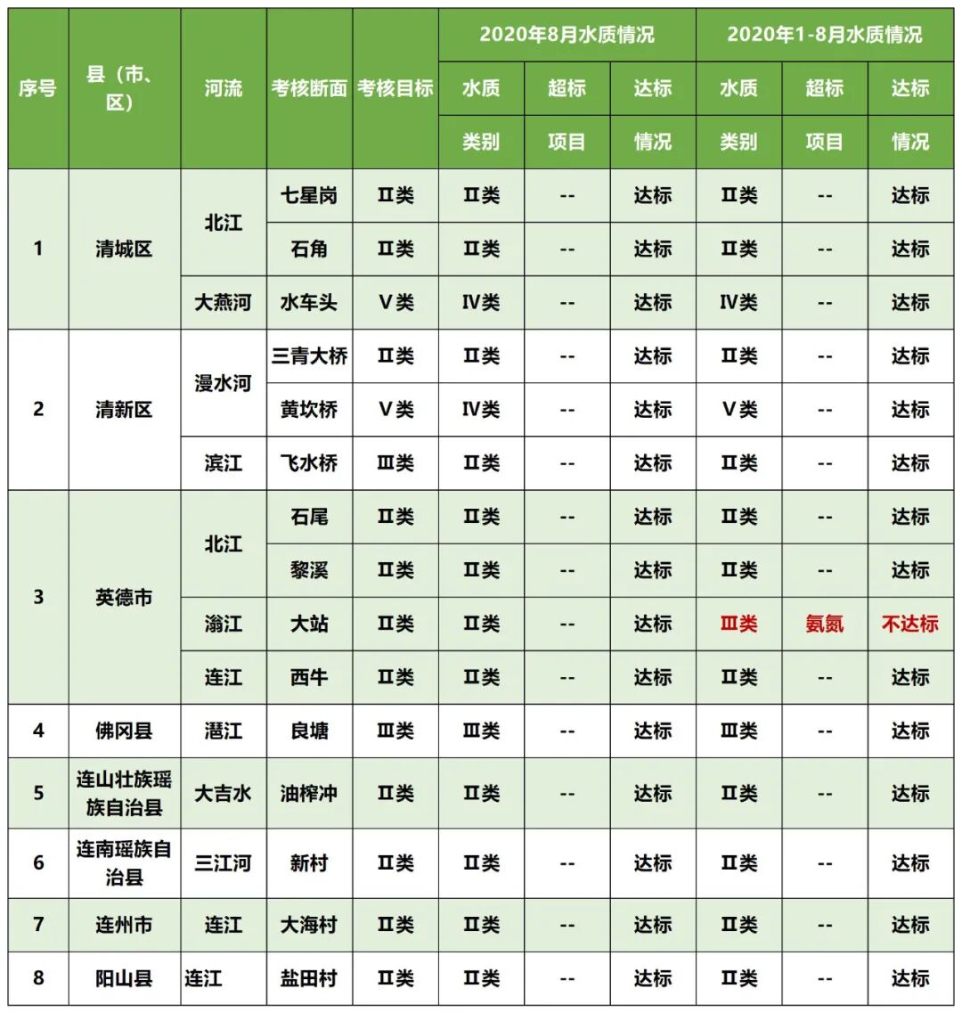2020年1-8月国考断面达标情况:按照清远市自测数据统计,4个国考断面均满足国家水污染防治考核目标要求。