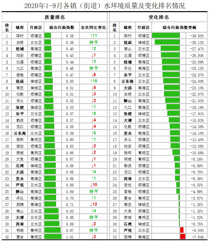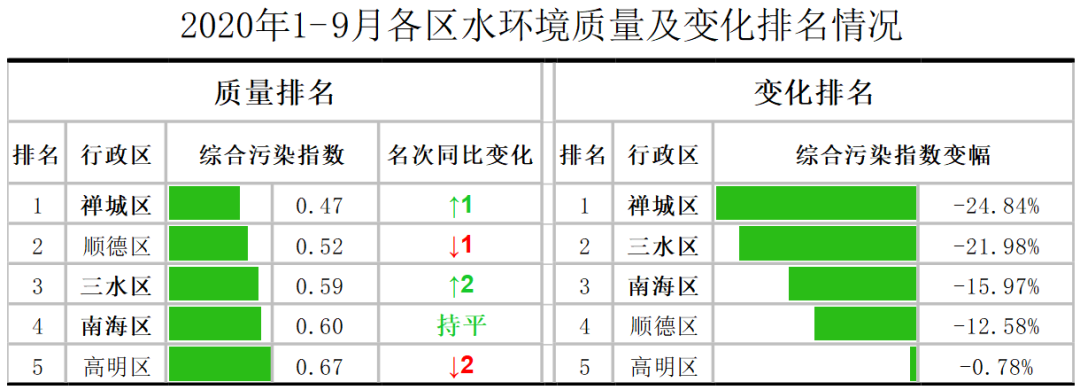 水环境质量排名前五名分别为:陈村、白坭、桂城、均安、北滘,后五名分别为:南山、大塘、西南、明城、更合;变化排名前五名分别为陈村、祖庙、南山、北滘、桂城,后五名分别为大良、荷城、石湾、芦苞、西樵。