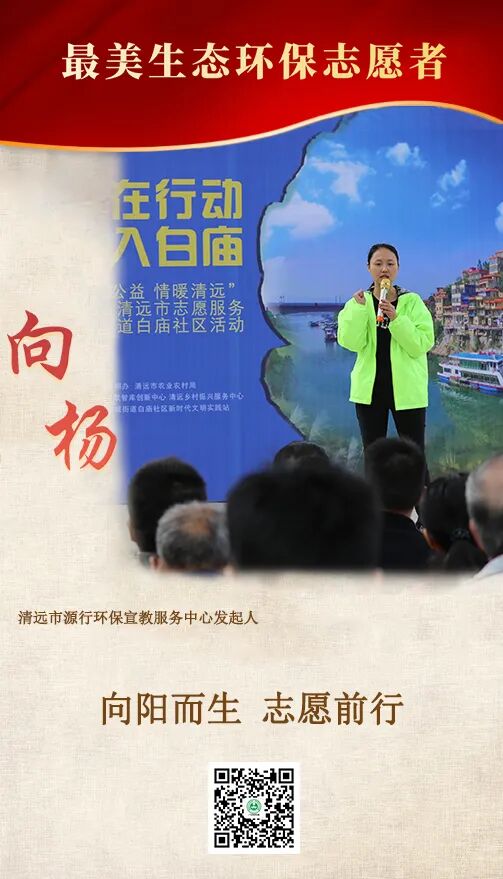 向杨于2007年大学毕业后曾在广州大型企业担任过客服部主管、市场部经理,工作之余坚持参加探望敬老院老人、自闭症儿童和抗战老兵等公益活动。2015年定居清远后,她怀着对环保的初心,以自己的实际行动积极参与到各项环保志愿活动中,并先后获得“阿拉善SEE2016年度创绿家”“2019年广东省最美生态环保志愿者”等荣誉称号。