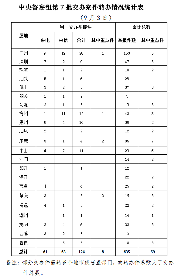 截至9月3日,中央督察组交办举报案件7批共617件(来电401件,来信216件),其中列为重点关注案件共54件;交办督办案件共1件。